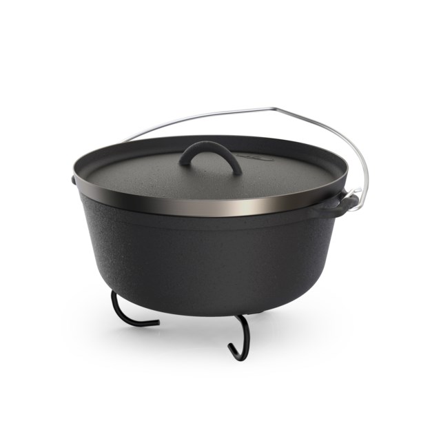 Guidecast Dutch Oven fra GSI Outdoors er en solid støpejernsgryte som er 30 % lettere enn tradisjonelle støpejernsprodukter, men med alle de samme egenskapene. Kjelen er svært motstandsdyktig mot korrosjon og riper, og har en polert bunn som gjør den anvendelig til bruk på alle varmekilder, inkludert induksjonsovn. Det følger med et praktisk stativ ved bruk på bål.